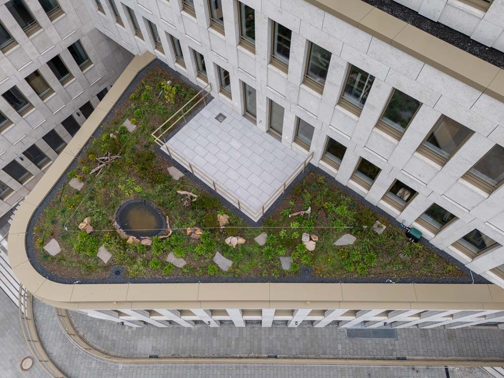 Ausführung einer großflächigen extensiven Dachbegrünung auf mehreren Ebenen
